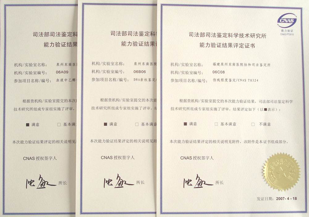 司法部司法鉴定科学技术研究所能力验证结果评定证书